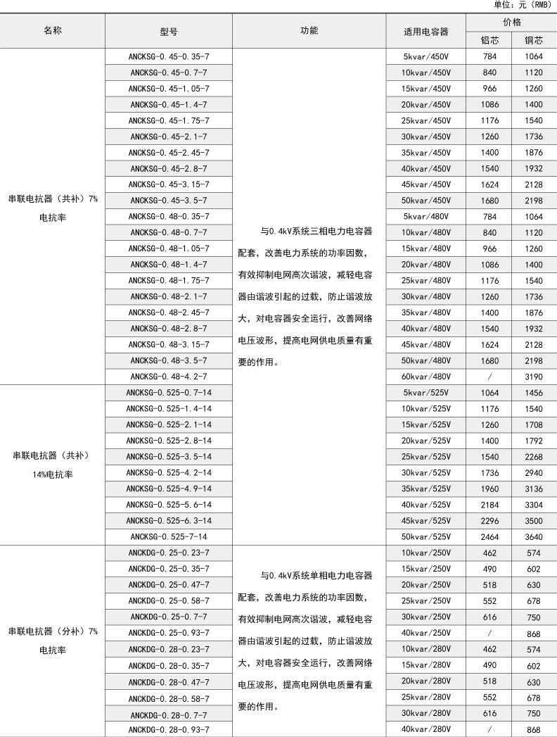 技術要求:適用電容器5kVAR;7%電抗率;銅芯